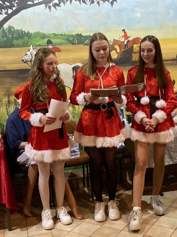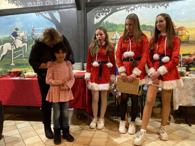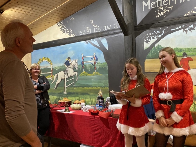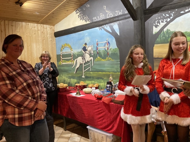 Der Nikolaus selbst war jedoch leider verhindert, ließ es sich nicht nehmen, gleich drei seiner jungen Vertreterinnen in das Vereinsheim zu senden. Diese wurden bereits von Jung und Alt sehnsüchtig erwartet. Joelle Burg, Fiona Hurson und Jolina Müller vertraten ihn würdig und haben denn Vereinsmitgliedern auf eine charmante Art und Weise und mit einem Zwinkern im Auge die aktuellen Vorstandsmitglieder vorgestellt. Ein besonderer Dank ging an die Platzwarte Jupp Weiler und Hans Stein, die seit vielen Jahren die Reitanlage hegen und pflegen und auf den „heiligen“ Rasenplatz aufpassen, welcher nur für Veranstaltungen von Pferd und Reiter betreten werden darf. In der vergangenen grünen Saison durften die Mitglieder den Rasen jedoch gelegentlich zum Springtraining benutzten. Das freute die Nikoläusinnen im Namen aller Mitglieder sehr.